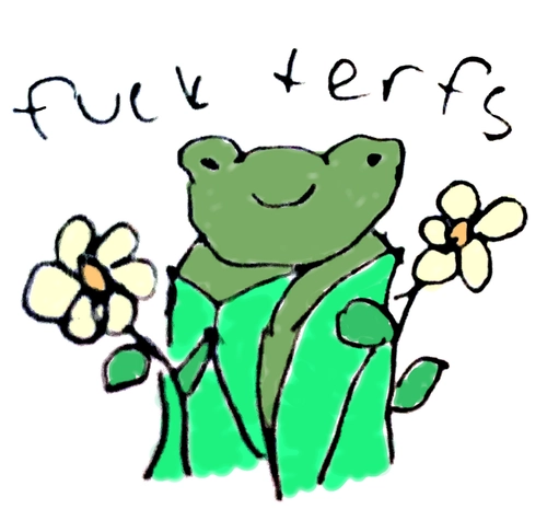 trying to not feel stressed today, so I digitally colored a smol frog that says fuck terfs! >m< i have no idea if I did that right bc it’s my first time using yarn to post an image so rip to me if I messed that up :’D